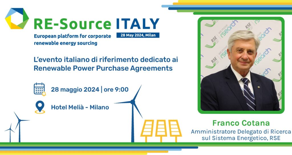 L’Amministratore Delegato di RSE Franco Cotana partecipa il 28 maggio a Milano, presso l’hotel Meliá all’evento “RE-Source Italy 2024”, dedicato ai Renewable Power Purchase Agreements e promosso da MBS Consulting e da RE-Source Platform.